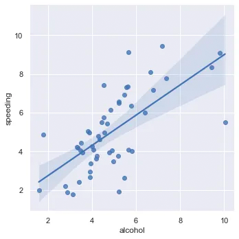 This graph is good for understanding the relationship between two variables, and Seaborn automatically performs linear regression for you. Here, we also use a Seaborn sample dataset to understand the relationship between alcohol consumption and driver speed at the time of an accident.